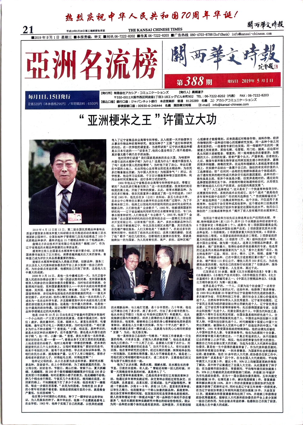许雷,盘锦北方农业技术开发有限公司董事长。原全国人大代表、全国政协委员、辽宁省政协常委、国家级有突出贡献专家、全国农业推广先进个人、建国六十周年百名发明家、辽宁省优秀专家、劳动模范、优秀企业家、中国时代楷模十大突出贡献奖、首批享受国务院特殊津贴。 他从事水、旱稻育种研究50余年。“七五”至“十四五”期间,主持国家水稻重点项目17项,省、部级水、旱稻重点项目22项。他经过多年辛勤努力,总结并创造出具有高价值的快速育种法-“人工选择理论”及“性状相关选择法”、“性状跟踪鉴定法”和“耐盐选择法”三法集成育种技术(经省科技厅组织专家鉴定达国际先进水平)。应用此技术,先后主持选育出生产应用的水稻、旱稻、特种稻新品种(系)125个,其中29个水、旱稻新品种经省级审定,9个国家审定。成果中:有1项获国际最高金奖;1项获世界高端米品鉴大赛优质粳米品牌银奖;2项获优质米水稻品种国际名牌产品奖;2项获国家优质米水稻品种金奖,3项获银奖;2项获国家重大科技发明奖;7项获省、部级科技二等奖;6项获省政府科技进步三等奖,2项获省政府重大科技成果转化奖;15项获市(厅、局)级科技进步一等奖。是中国农业领域,做为第一完成人,选育北方粳稻品种最多、获奖最多、推广面积最大、取得社会经济效益最高的专家。他选育的辽盐系列水稻品种被国家列为“九五”重中之重推广项目。他主持选育的“辽盐、雨田、田丰、锦丰、辽旱、锦稻、盘粳”等系列水、旱稻新品种,已在中国北方适宜稻区累计推广2.2亿多亩,增产稻谷120多亿公斤,增收人民币400多亿元。